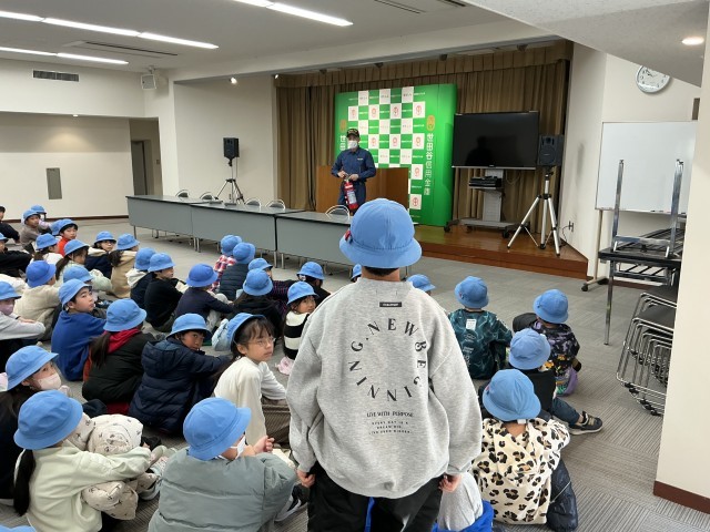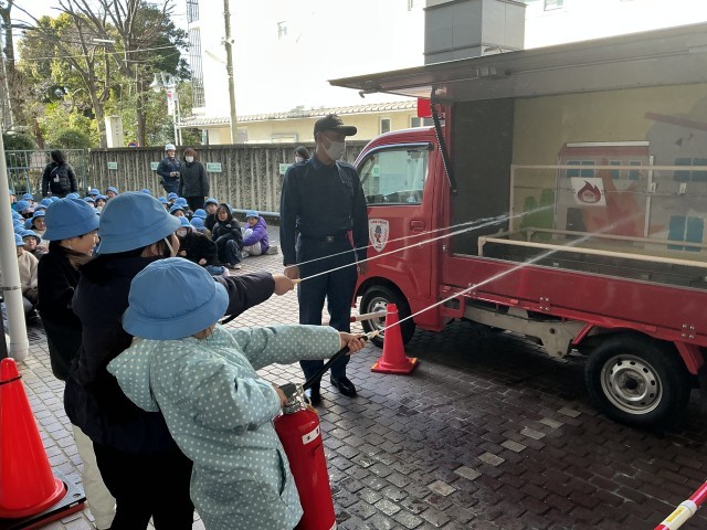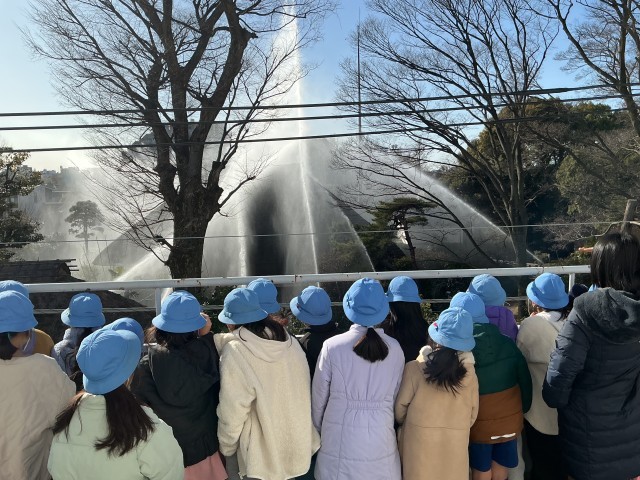 防火訓練では、実際に消防車の動きや放水作業をみて、とても興奮していました!