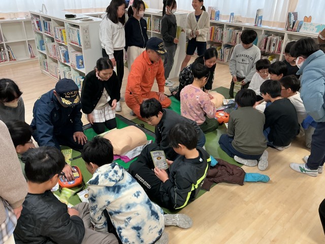 5年生は、心肺蘇生やAED体験、正しい手洗いの仕方学習、起震車体験をしました。画像は、AED体験と起震車体験です。