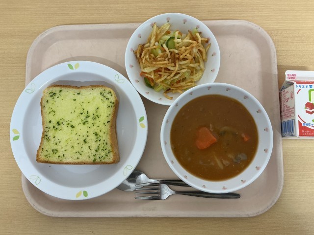 牛乳 ガーリックトースト ブラウンシチュー じゃがいものサラダ