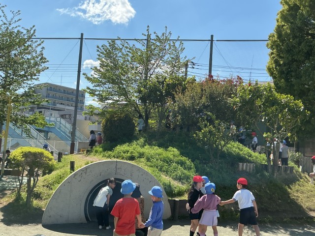 今日は風は少しありますが、とても気持ちいいお天気の中、2年生、1年生がグループに分かれて校庭探検をしました。