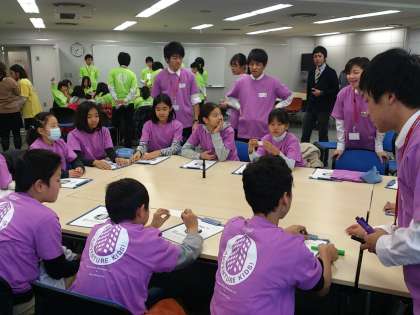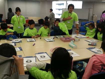 グループに分かれ、色別のTシャツを着て、学習がスタート!