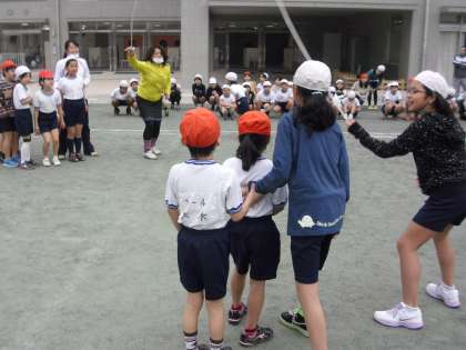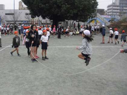 体育委員会の高学年児童が、縄の回し手に加わってくれたり、縄に入るタイミングがなかなかとれない子の背中をそっと押してくれたりします。