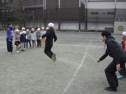 体育委員会の5・6年生が縄の回し手として、支えてくれます。