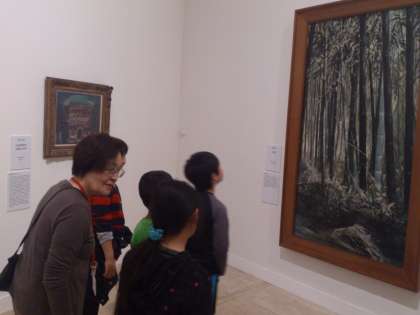 梅原龍三郎や棟方志功、横山大観など著名な画家の作品に触れる子達。
