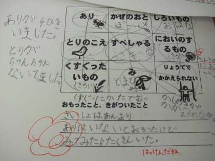 1年生が生活科で校庭で見つけたものを書き込む「ネイチャービンゴ」に挑戦しています。