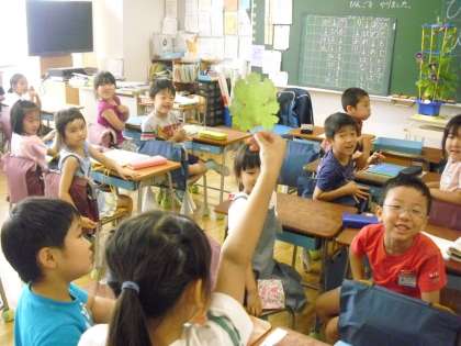 校庭で見つけた手のひらのような葉っぱをみんなに紹介してくれる子もいました。