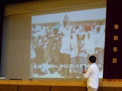 実際に寄付された洋服を着て、笑顔を見せる難民の子どもたちの写真がたくさん紹介されました。子どもたちはみな、食い入るように写真を見ながら職員の方の説明に聞き入ってしました。
