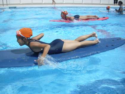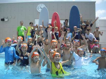 第1部は、プールでサーフボードを使い楽しいサーフィン体験。