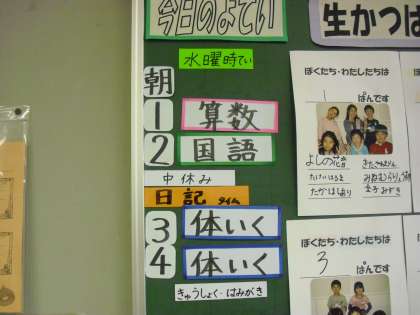 低学年の学級では、「今日の予定」を黒板に示し、子ども達が主体的に学校生活が送れるようにしています。