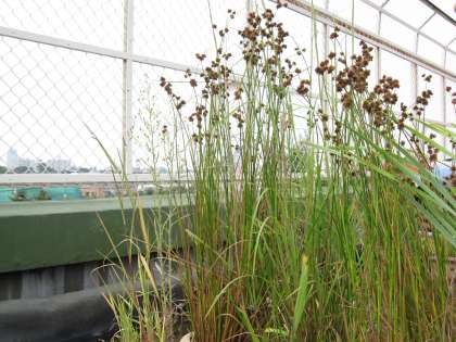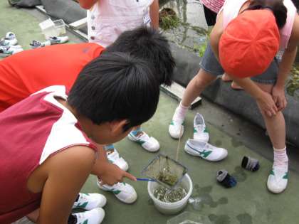 屋上のビオトープで休み時間を満喫!池に入って生き物をさがしています。