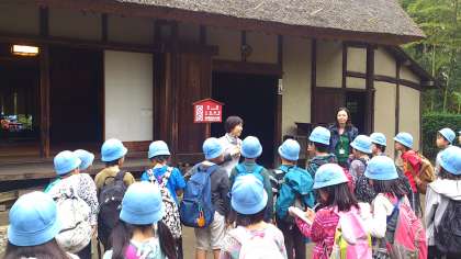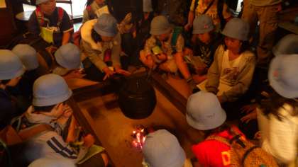 囲炉裏を囲んで係の方から昔の暮らしについてお話を聞きます。