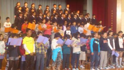 20分ほどのパート練習のあと、いよいよ桜小、世田谷小、桜木中の子どもたちによる全員合唱が披露されます。
