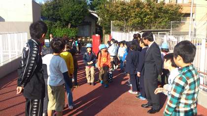 初日の今日は、桜木中学校の校長先生も桜小の赤門に来て、中学生とともに子どもたちにあいさつをしてくださいました。