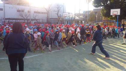 準備運動をしっかりしてから、音楽のリズムに乗って校庭を走ります。