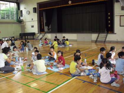 遠足の同じ班の友だちと一緒にお弁当をおいしく食べました。
