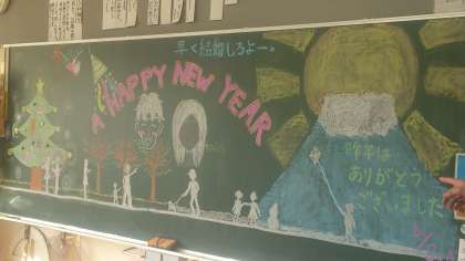 6年生のクラスでは子どもたちが黒板に縁起のいい絵を描いて新年のあいさつを書いてくれました。