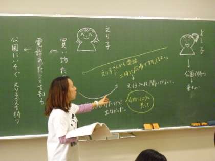 先生が物語の構造をイラストを用いて黒板に整理し、子ども達の思考を助けます。