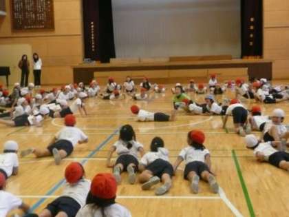 講師に、世田谷区親子体操連盟指導委員長の津布久先生をお迎えし、リズム体操や跳び箱・マット・平均台などの用具を使った活動を指導していただきました。