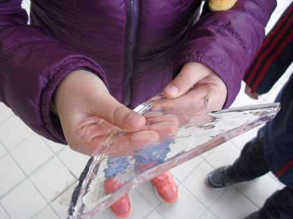 朝、おはようのあいさつに立つ私に今日は、子ども達が「氷」を見せてくれました。
