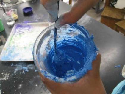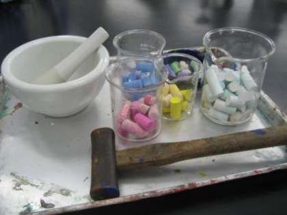 小さくて使いにくくなったチョークを小さく砕き、水を加えます。