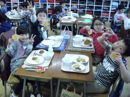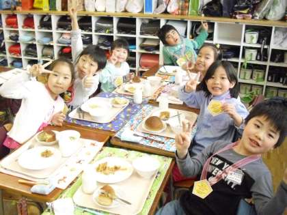 1年生が、給食を残さず食べる完食100回を達成しました。