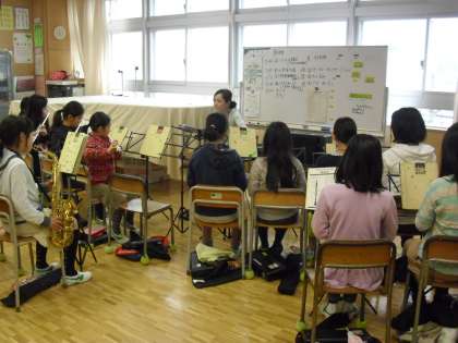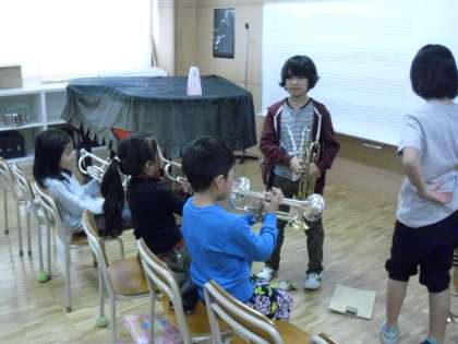 新入部員に上級生が、優しく楽器の構え方、音の出し方を教えています。