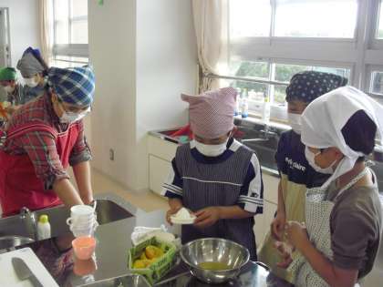 5年生の子どもたちは真剣に先生の注意を聞いて、協力してしっかり調理実習に励んでいます。