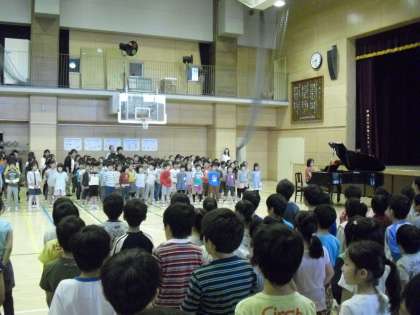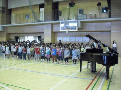 全校で校歌と「さくらの子」、そして運動会で歌う「ゴー・ゴ−・ゴー!」を歌いました。