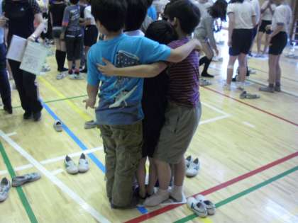 6年生は、組体操の練習の成果かチームワークよく互いを支え合って、小さくなった新聞紙の上に立っていました。