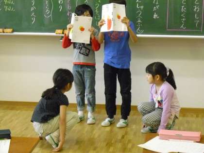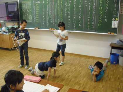 4人一組で登場人物やナレーションに分かれ、動作化も入れて楽しく発表します。