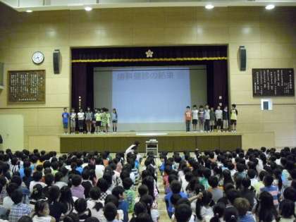 保健員会の子ども達が考えたむし歯クイズで全校は大盛り上がり。楽しみながらむし歯予防の意識を高めました。