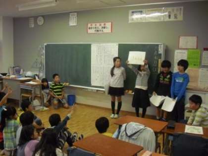 川場村移動教室の学習発表会を4年生に向けて行いました。テーマごとにクイズを出したり、体験談を話したり、工夫しながらの発表です。4年生からは手がバンバン上がり、真剣に聞く様子が見れました。発表後、4年生にどうだったか聞くと、「楽しかった♪」「早く川場に行きたくなった!」とうれしい言葉が!