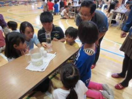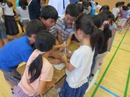最後は班ごとに汚れた水をきれいにする実験をしました。