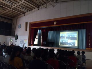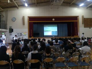 まずは、体育館で中学校での学校生活について、先輩の中学生から説明を聞きます。