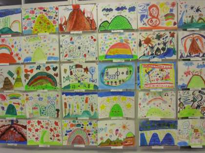 図工「えのぐじま」は、子どもたちが行ってみたい島を想像して描きました。