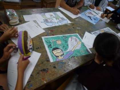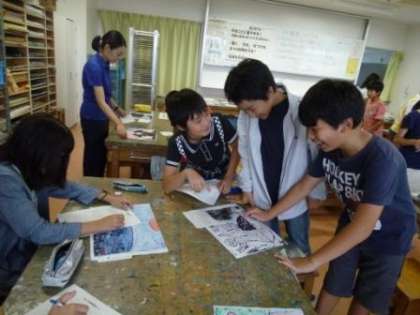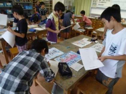 図工では,彩り版画の作品を互いに鑑賞しました。