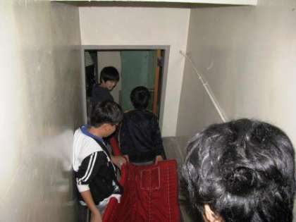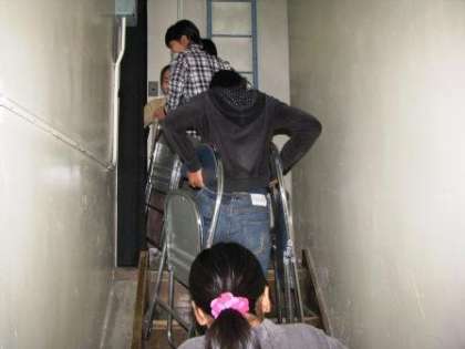 写真(下)・・・・パイプいすを舞台下から運び出します。