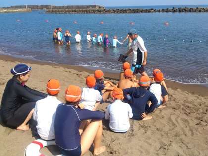 海の浮力を生かしてリラックスして泳ぐめあてをしっかり確認して、いざ入水!