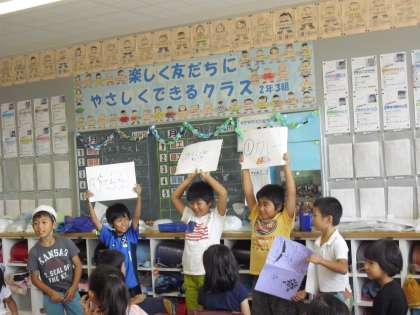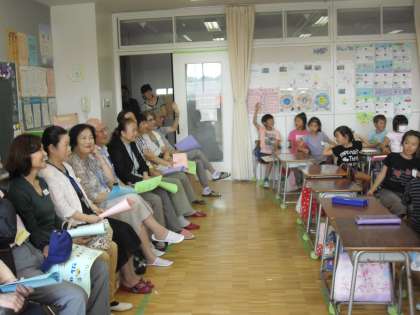 子どもたちがおじいちゃん・おばあちゃんを教室に案内して各クラスで始まりました。