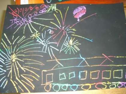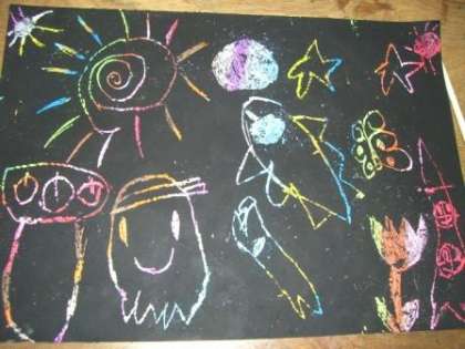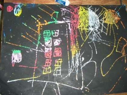 絵の具がかわいたら、わりばしの先でひっかきながら