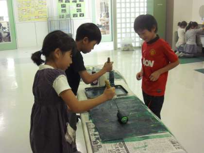 版画では、ようやくローラーで色を塗るところに入りました。