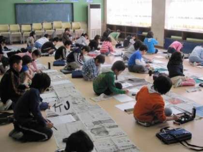 長い半紙に書き初めの練習をしました。床に座って書くのは初めてですが、音のない空間で、集中して練習に取り組むことができました。