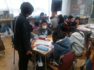 5年生が家庭科の学習でグループごとにテーマをもった献立づくりをしています。