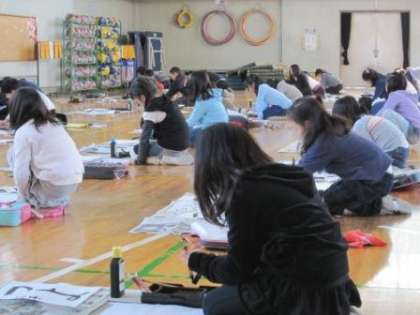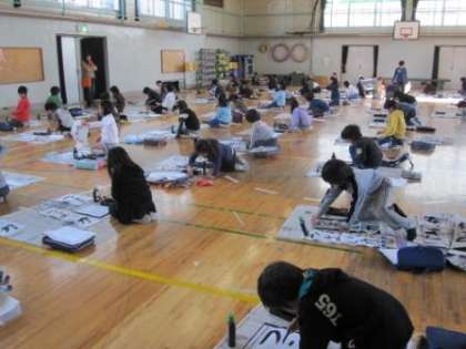 体育館は冷えわたり、しんとした雰囲気の中書き初めをしました。