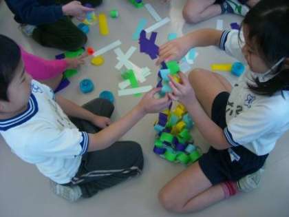 つなげた輪飾りのはじをそろえて、他の班と長さを比べたり、