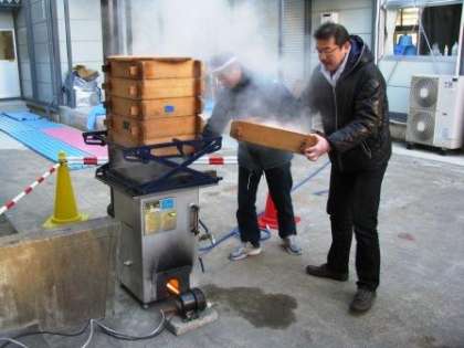 写真(上)------蒸籠(せいろ)で餅米を蒸します。