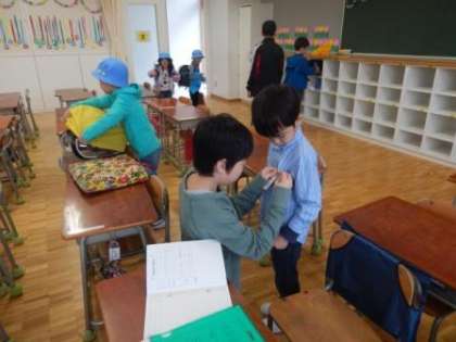 桜小の最高学年として、6年生は1年生のお世話をしています。まだまだ分からないことがたくさんある1年生に、優しく、丁寧にやることを教えてあげています。なかなか上手くいかないこともありますが、1年生の笑顔のため、頑張っています!