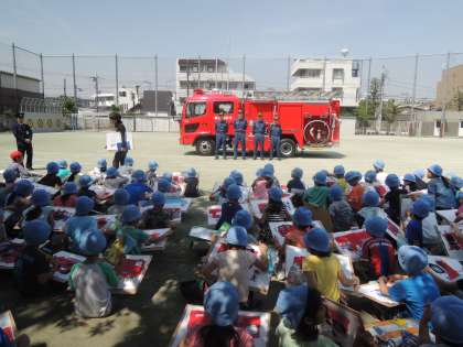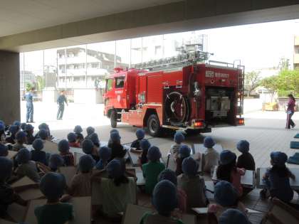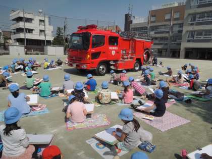 4月28日に「消防写生会」がありました。普段生活していて、なかなか消防車をじっくり見る機会はないですが、「はたらく消防写生会」では、世田谷消防署から「ポンプ消防車」が学校まで来てくれます。めったに見れない消防車に子ども達は