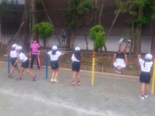鉄棒、短縄跳び、長縄跳び、ドッチボールと子どもたちが楽しんで運動に親しむよう1時間の中にも様々な活動をしていきます。
