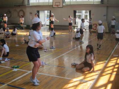 子どもたちはそれぞれペアになって交互に2分間ずつ短縄を跳び、記録をとりました。